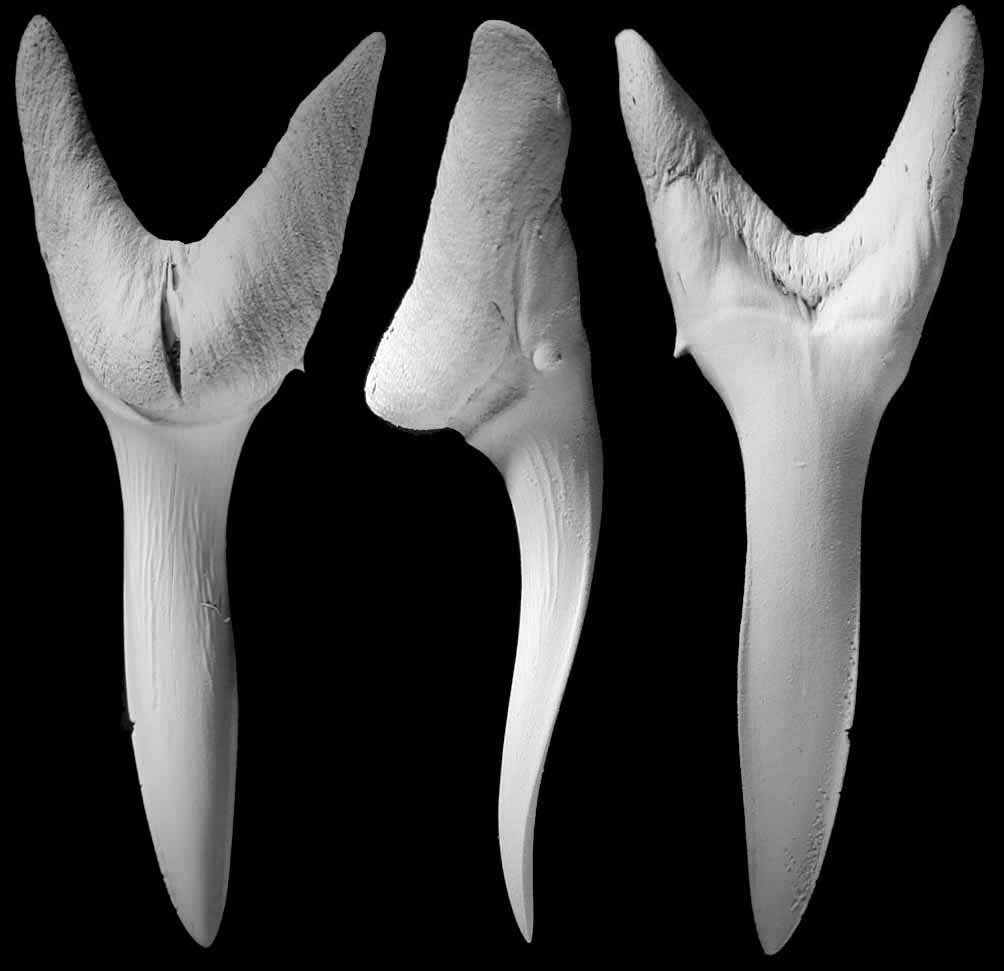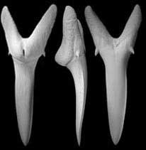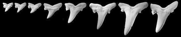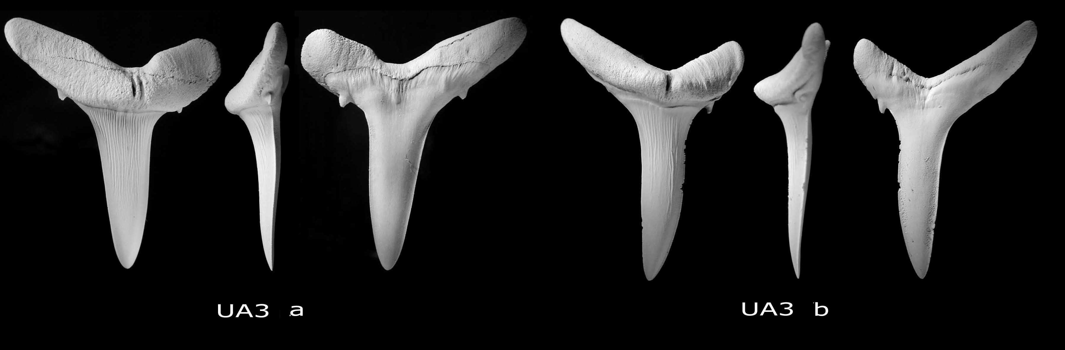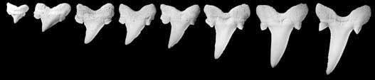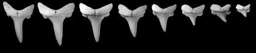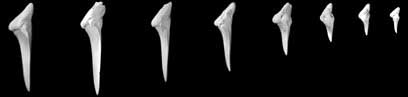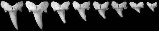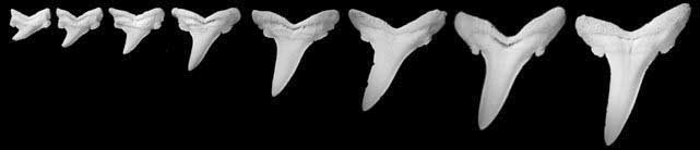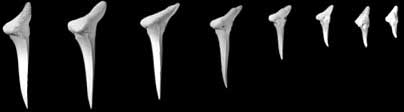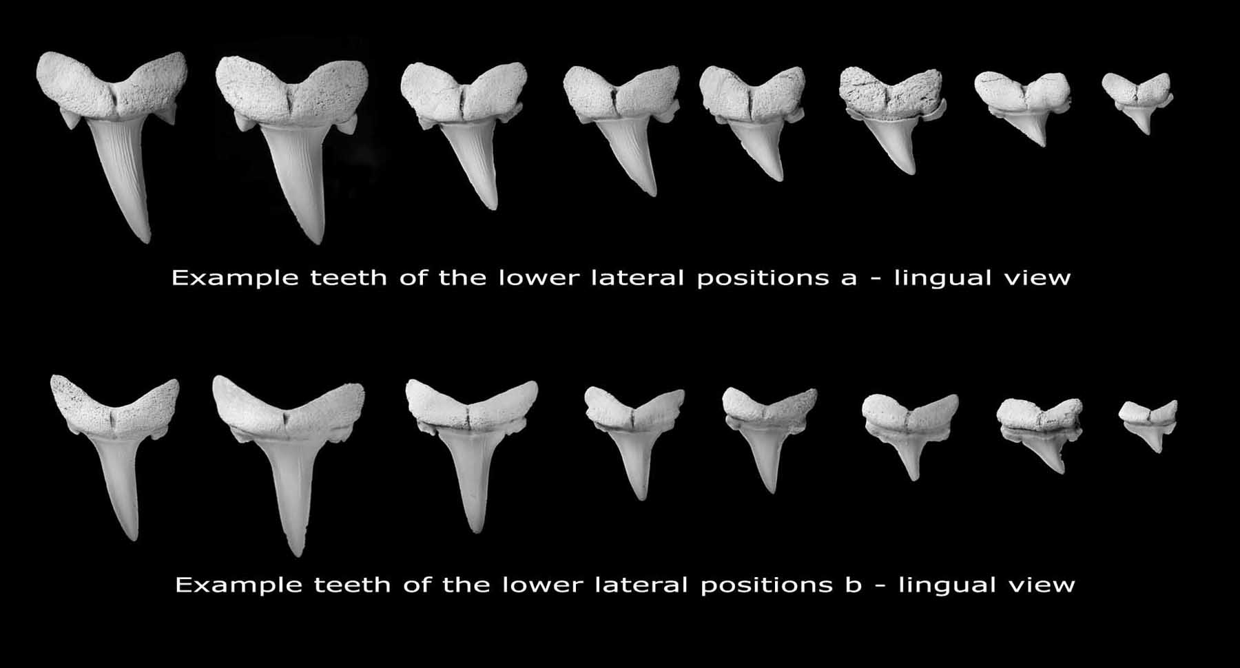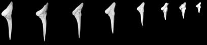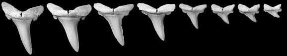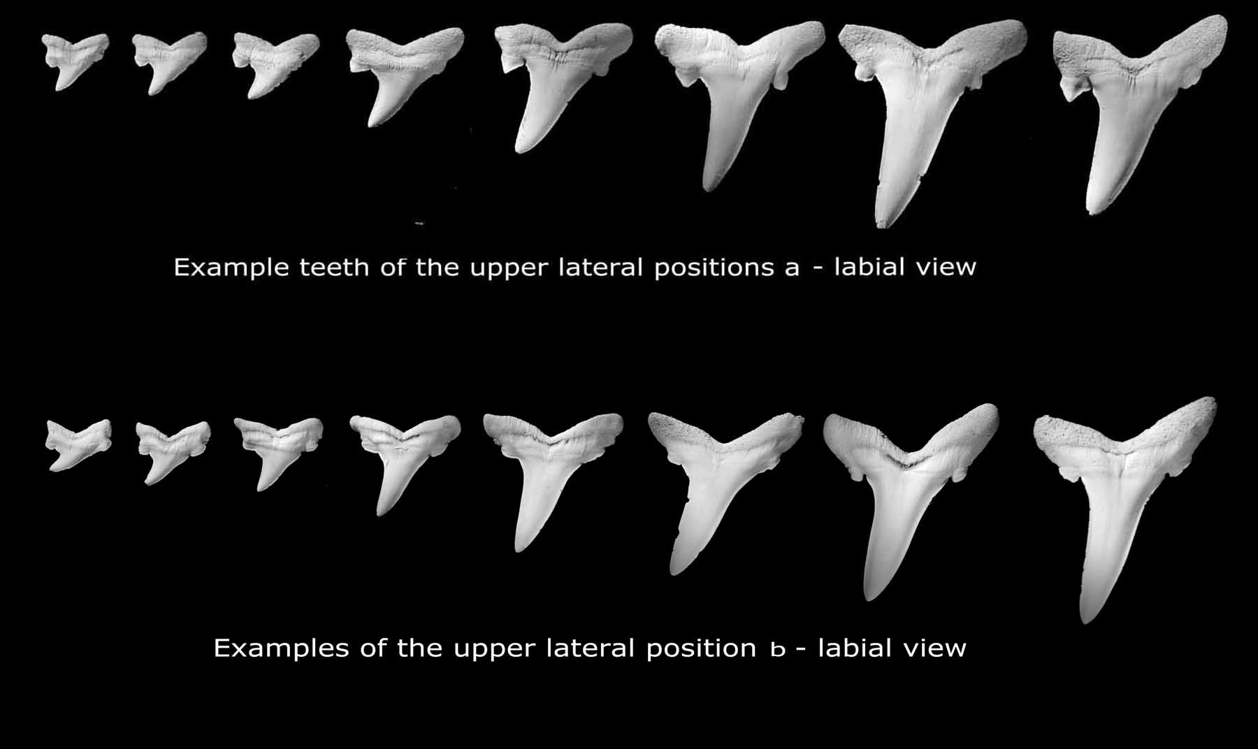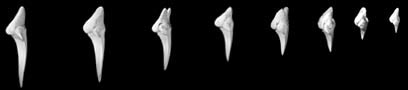 ammonium chloride to enhance detail. All positional characters are derived from, and comparable to, extracted C. taurus teeth. Distinguishing characters that define each subset are consistent from anterior to posterior teeth and throughout ontogeny. The 8 files for each lateral subset shown below are arbitrary. It is not know how many files S. Macrota had. However, the teeth depicted below represent the array of positional changes in the study set. In the study set of 9,250 teeth, subset "a" totaled 5,665 teeth; while subset "b" totaled 3,298. The total count of first upper anterior teeth is 287 suggesting that only one subset has this position. The UA1 is consistent in characters and cannot be differentiated into subsets.